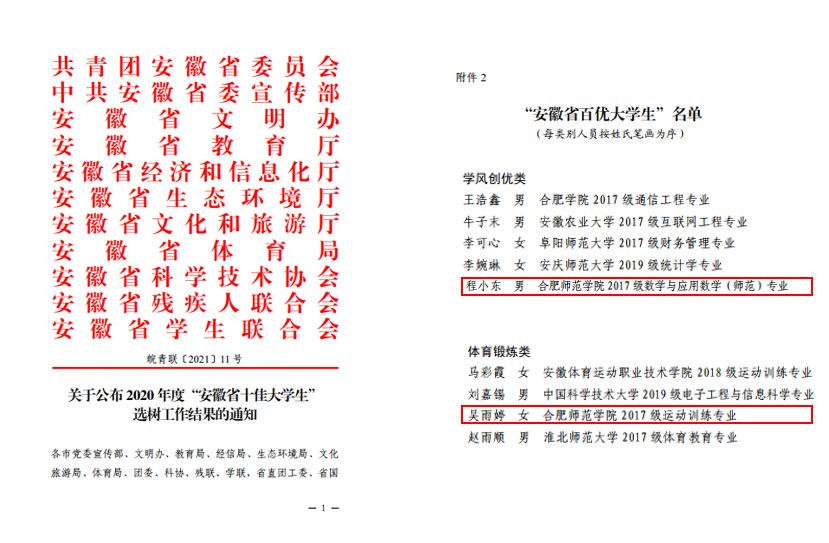 本网讯近日,团省委、省委宣传部、省文明办、省教育厅等11家单位联合印发《关于公布2020年度“安徽省十佳大学生”选树工作结果的通知》,我校数学与统计学院程小东、体育科学学院吴雨婷2名同学获评“安徽省百优大学生”荣誉称号。