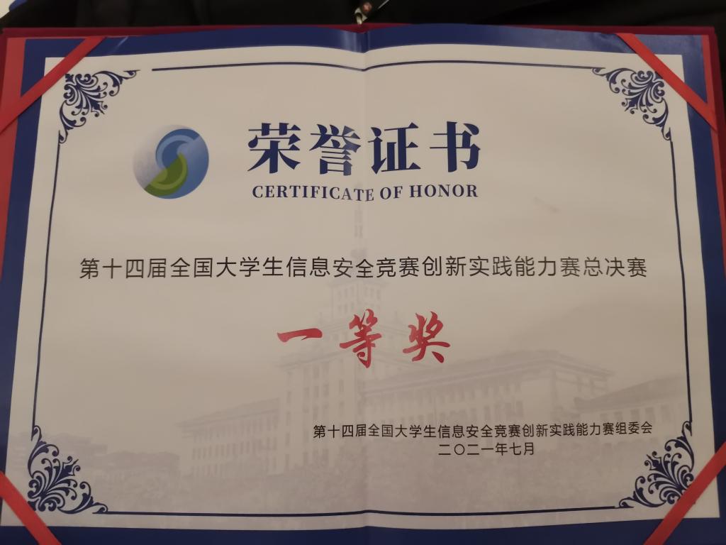本网讯近日,第十四届全国大学生信息安全竞赛-创新实践能力赛”全国总决赛在哈尔滨落下帷幕。来自我院计算机学院的高星雨、唐端端、周鹏辉和陈浩同学组成EDI战队首次代表我院参加该项赛事,并以总分5369分的成绩荣获一等奖,冯玉婷老师作为该队指导老师荣获 “优秀指导老师奖”,队长高星雨在Build赛项中设计的参赛试题以排名第四的成绩获得“创新实践设计奖”。