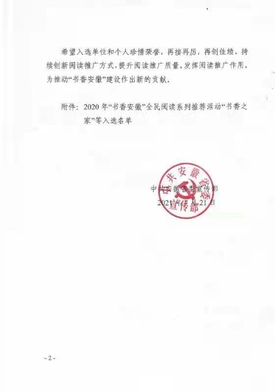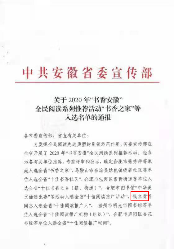 本网讯近日,中共安徽省委宣传部印发《关于2020年“书香安徽”全民阅读系列推荐活动“书香之家”等入选名单的通报》,我校机关第二党委书记钱立青入选全省“十佳阅读推广人”。