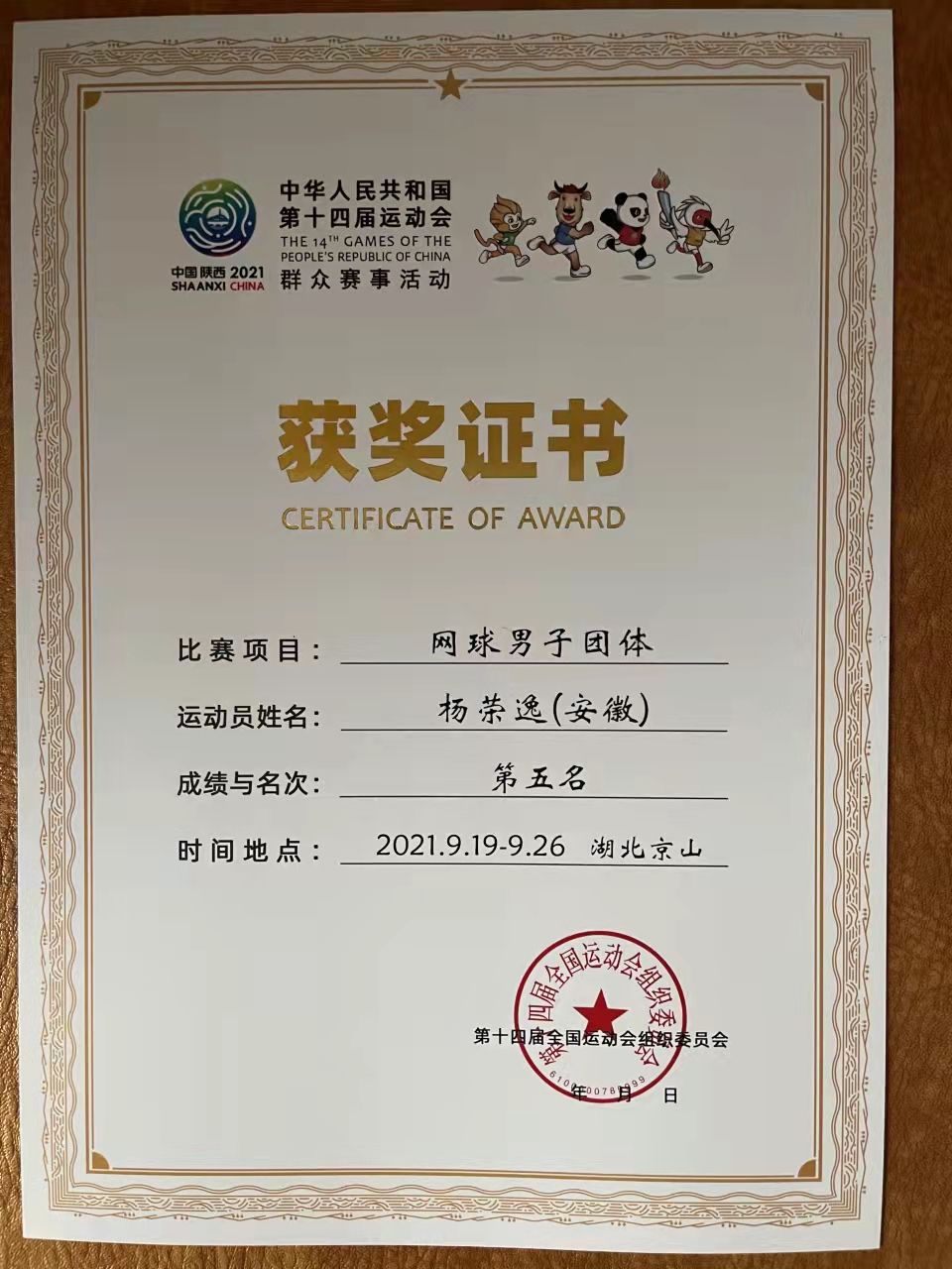本网讯9月19日至26日,第十四届全国运动会群众比赛网球比赛在湖北省荆门市京山市举行。我院教师杨荣逸入选安徽省网球队,代表安徽省参赛,取得了网球男子团体第五名的好成绩,安徽省也是“华东三省一市”中唯一打进本届全运会网球比赛男子团体前八的省份。