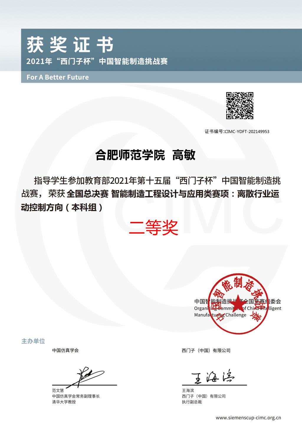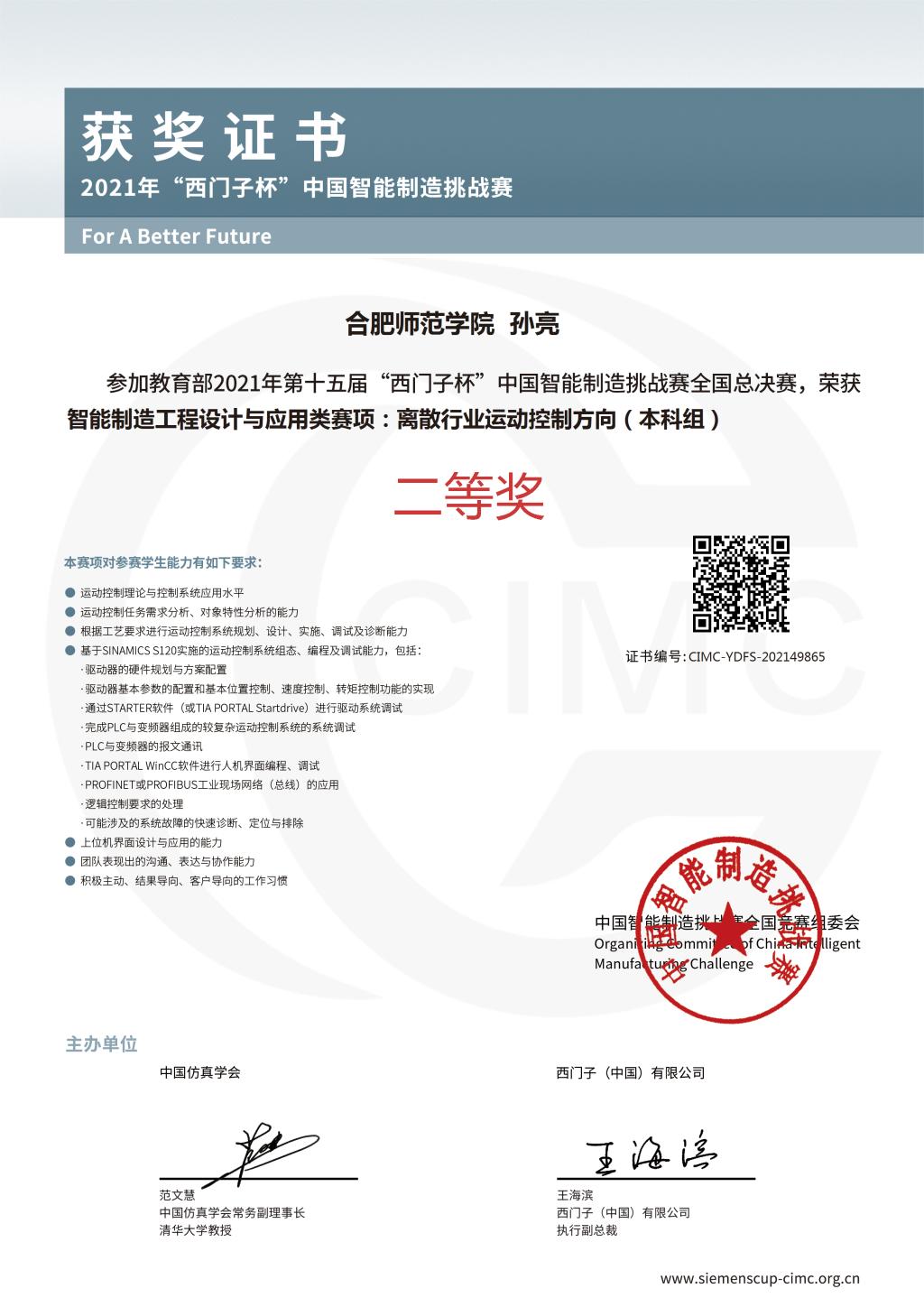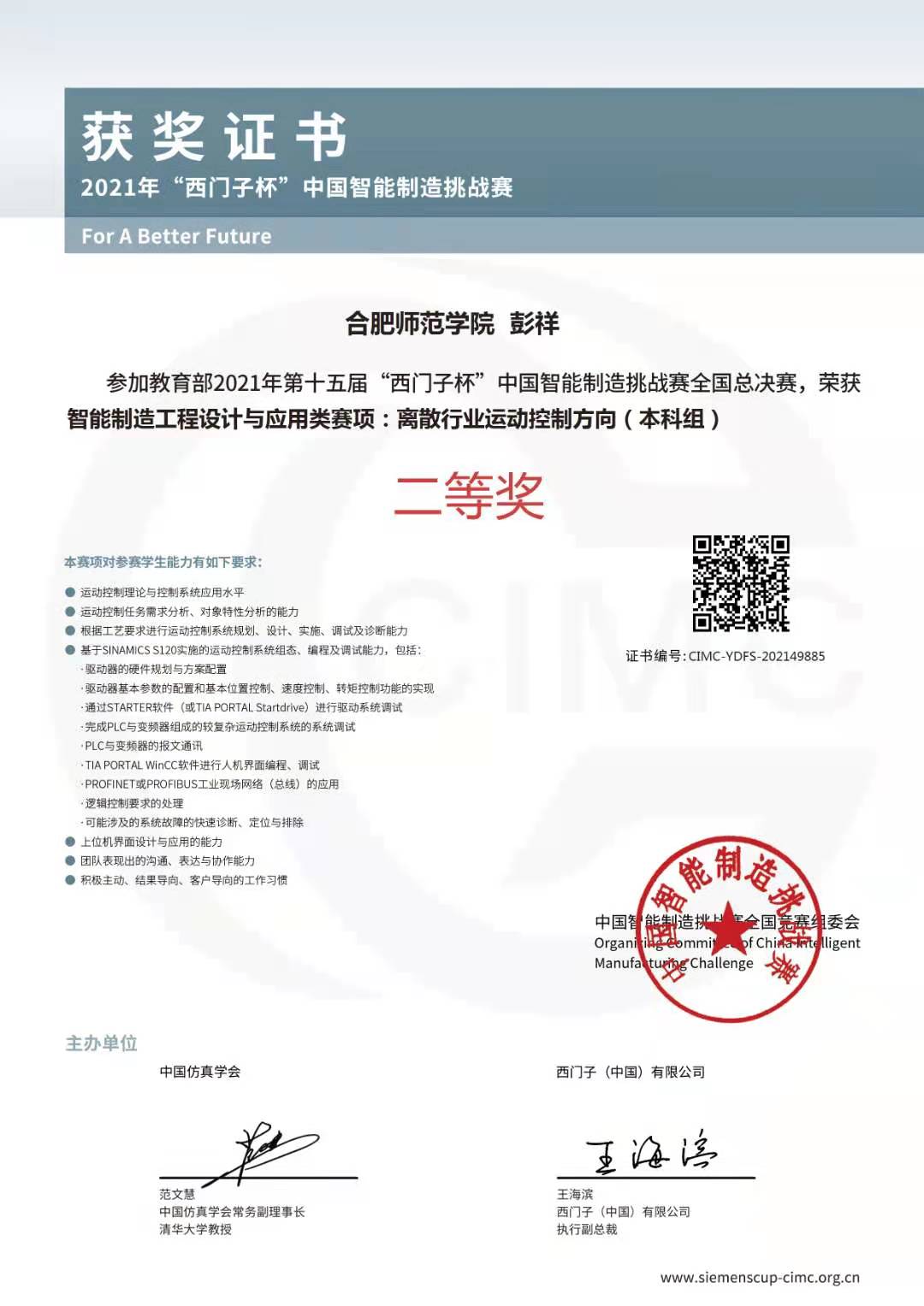 本网讯近日,2021年第15届“西门子杯”中国智能制造挑战赛全国总决赛结果正式揭晓。我院电子信息与电气工程学院学子彭祥、孙亮在申远、高敏两位老师指导下以安徽省赛一等奖的名次晋级全国总决赛,在全国总决赛中获得“离散行业运动控制方向”项目二等奖,这也是该赛事自举办以来我院历史上首次获得国赛奖项。