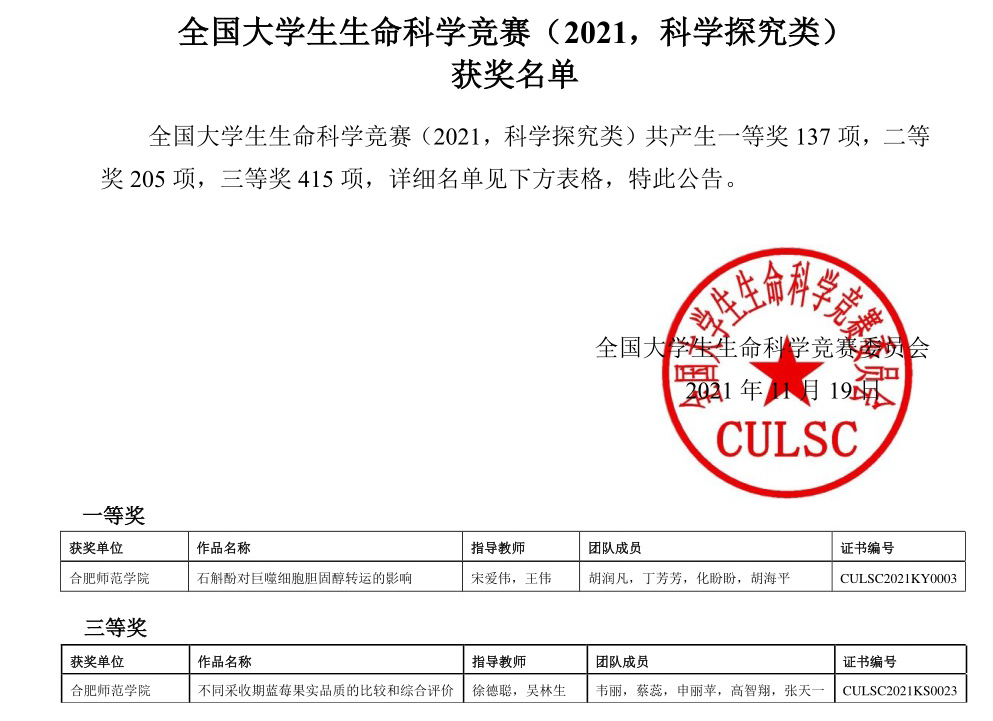 本网讯近日,2021年全国大学生生命科学竞赛决赛落下帷幕。经过网评、省赛和国赛三个环节,由我院生命科学学院王伟和宋爱伟老师指导,胡润凡、丁芳芳、化盼盼和胡海平同学参加的《石斛酚对巨噬细胞胆固醇转运的影响》荣获一等奖(科学探究类国赛最高奖项);由沈章军和徐德聪老师指导,杜荣荣、张帅、张舒畅、郑颜晨、高潇和季涛涛同学参加的《优创·荟民》荣获二等奖(创新创业类);由徐德聪和吴林生老师指导,韦丽、蔡蕊、申丽苹、高智翔和张天一同学参加的《不同采收期蓝莓果实品质的比较和综合评价》获得三等奖(科学探究类)。本次比赛为我院参加全国大学生生命科学竞赛以来历史最好成绩,生科学子再一次用知识和智慧交出了一份靓丽答卷。