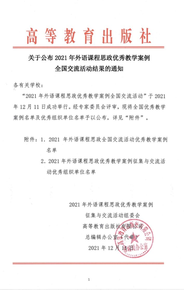 本网讯近日,由高等教育出版社、全国高校教师网络培训中心、《中国外语》编辑部联合主办的“2021年外语课程思政优秀教学案例全国交流活动”拉下帷幕,经过紧张激烈的专家评审和现场答辩,我院教师团队李政、强云、吴珊珊、黄波、骆雁雁等老师在本次比赛中荣获大学英语组全国二等奖的好成绩。