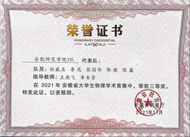 本网讯日前,安徽省教育厅公布了2021年安徽省大学生物理学术竞赛(CUPT)结果,我院2019级物理学专业和新能源与器件专业任威名、李昆、张国伟、郭健、陈鑫同学联合组成的代表队荣获三等奖,2019物理学专业梅凯运、邰贵宝、章婷婷、李哲、王超组成的代表队获得优秀奖。