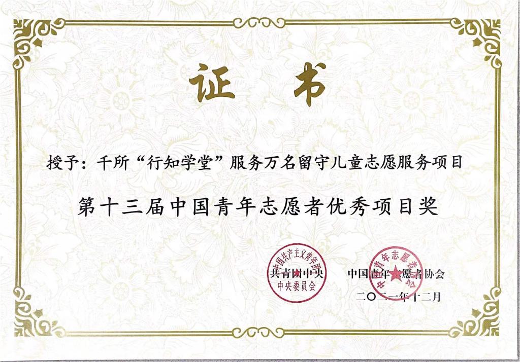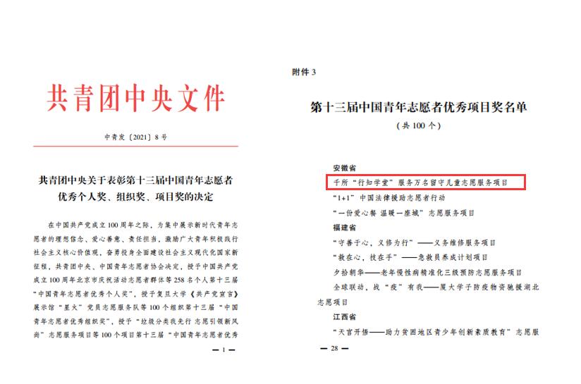 本网讯近日,共青团中央印发《关于表彰第十三届中国青年志愿者优秀个人奖、组织奖、项目奖的决定》,我院“千所‘行知学堂’服务万名留守儿童志愿服务项目”荣获第十三届中国青年志愿者优秀项目奖。该奖项是我国青年志愿服务领域的最高荣誉,本次全国共有100个项目获奖,安徽省仅3项,其中安徽省高校仅1项。