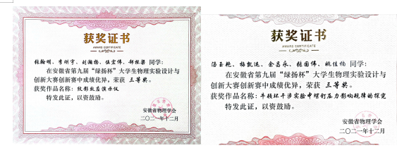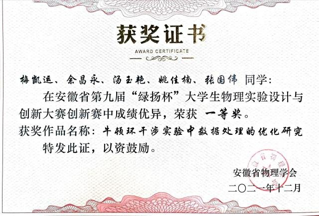 本网讯近日,2021年第九届安徽省大学生物理实验设计与创新大赛结果揭晓,我院三个参赛团队分别获得一个一等奖、两个三等奖。其中,物理与材料工程学院李仁文老师指导的梅凯运、余昌永、汤玉艳、姚佳楠、张国伟团队作品《牛顿环干涉实验中数据处理的优化研究》获一等奖;李仁文老师指导的汤玉艳、梅凯运、余昌永、张国伟、姚佳楠团队作品《牛顿环干涉实验中螺钉压力影响规律的探究》,陶蕊、冯源、李冬鹏老师指导的张翰明、李刚宇、刘瀚扬、伍宏伟、郜栋梁团队的作品《纹影效应演示仪》分别获得三等奖。