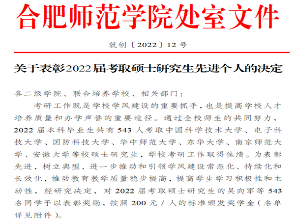 考研落下帷幕后,学院收集整理毕业生考研信息,并及时录入就业系统。同时印发表彰文件,对2022届考取硕士研究生的543名学子进行表彰,共计发放奖励108600元。