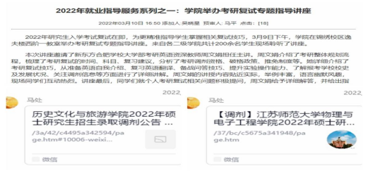 克服疫情的负面影响,持续推进高质量就业是一张工作答卷。为实现高分通过,学院积极举办考研复试专题指导讲座10余场,收集发布各院校考研复试调剂等信息50余条,帮助学生协调布置考研复试场地,多举措助力学生考研复试,用实际行动为实现高质量就业交出一份满意答卷。