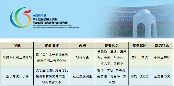 本网讯日前,“六百光年杯”第十五届全国大学生节能减排社会实践与科技竞赛在天津大学落下帷幕,我院本科生团队的两件作品分别获得全国三等奖,其中蒋杉与冯源老师指导、任淼淼等同学的作品“读‘芯’术—储能电池温度监测与预警系统”获科技作品类三等奖,杨刘与沈春芳老师指导、胡洋等同学的作品“大学生低碳行为意念反馈机制的研究与构建—以合肥市为例”获社会实践调查类三等奖。