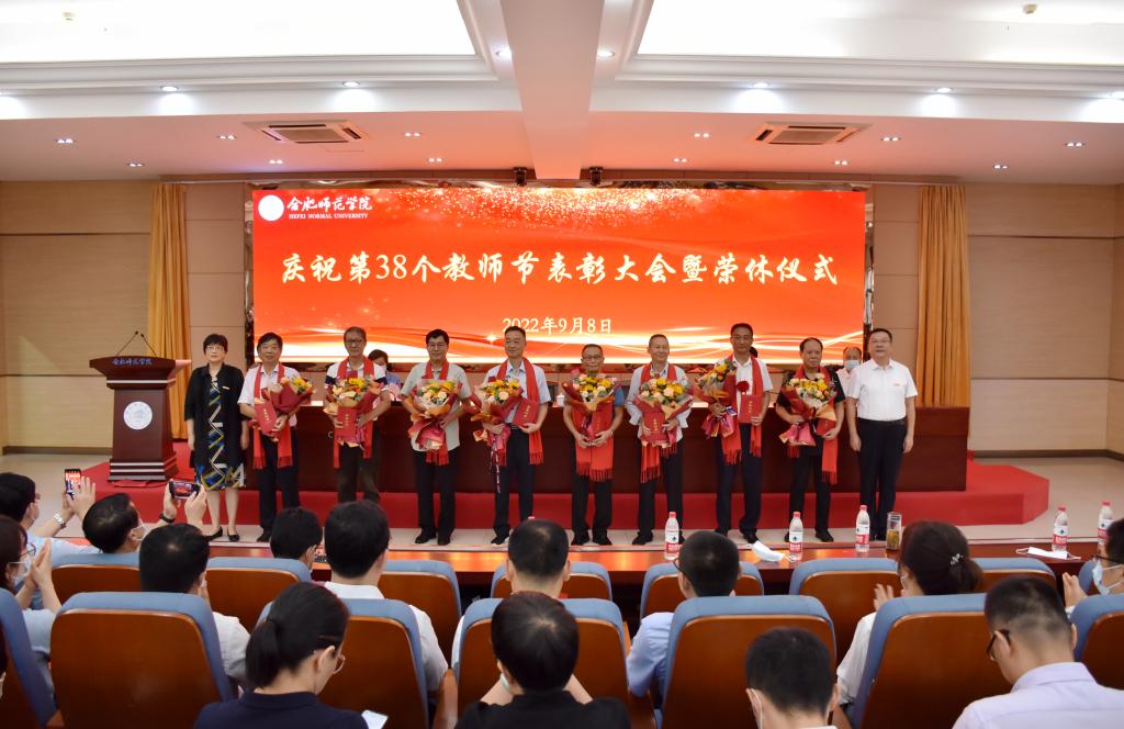 大会在庄严奏唱国歌声中开始?;嵘?,梁立昌宣读了《首届优秀教师、优秀教育工作者表彰决定》等表彰文件。党委书记徐成钢为首届院“优秀教师”颁奖,党委副书记、院长方东玲为首届院“优秀教育工作者”颁奖。院领导分别为第七届全国师范院校师范生教学技能竞赛一等奖指导教师,第十五届大学生节能减排社会实践与科技竞赛国赛二等奖指导教师,第七届中国国际“互联网+”大学生创新创业大赛国赛三等奖指导教师,第二届全国教师创新大赛安徽省赛获奖教师,第三届“长三角本科师范院校教师智慧教学大赛”获奖教师代表,为科研成果奖、优秀科研人才奖获得者;为教师教书育人满30周年(女满25周年)和管理服务育人满30周年(女满25周年)教职工颁奖;为“江博杯”“学陶师陶—三育人”先进个人颁奖;为“先进基层党组织和优秀党员、优秀党务工作者”代表颁奖。为首届院“优秀教育工作者”颁奖;为首届院“优秀教师”颁奖。青年教师向导师代表敬献拜师贴,行拜师礼,并合影留念。