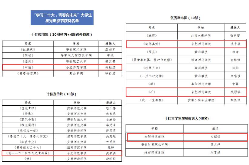本网讯近日,“学习二十大、青春向未来”安徽省大学生星光电影节评选活动结果揭晓。我院文学院关颖淇同学摄制作品《中途》获评“十佳微电影”,文学院关颖淇同学摄制作品《逐——二十四节气之青年篇》获评“十佳宣传片”,外国语学院沈子敬同学同学摄制作品《有你真好》、文学院关颖淇同学摄制作品《不》获评“优秀微电影”,外国语学院白垭淇同学入选“十佳大学生演员候选人”。