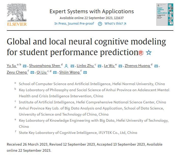 相关成果以“Global and Local Neural Cognitive Modeling for Student Performance Prediction”为题发表在计算机科学大类分区一区期刊Expert Systems with Applications上。该刊为中国科学院大类一区TOP期刊,影响因子为8.665。合肥师范学院为论文的第一单位,青少年心理健康与危机智能干预安徽省哲学社会科学重点实验室、计算机与人工智能学院苏喻老师为论文第一作者。
