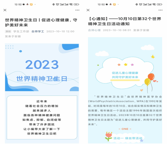 本网讯 2023年10月10日是第32个“世界精神卫生日”,主题为“促进儿童心理健康,共同守护美好未来”。为增强我院学生心理健康意识,提升学生精神卫生水平,营造良好心理健康氛围,学院于10月9日至13日在全院范围内开展了世界精神卫生日宣传活动。