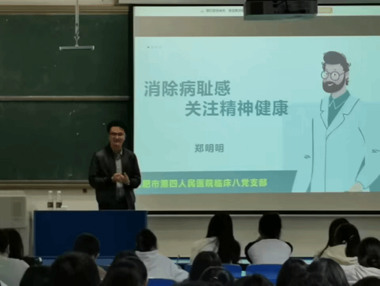 在本次宣传周中,学院首次开展“心理医生进校园”主题活动,邀请安徽精神卫生中心精神科主治医师郑明明和安徽医科大学附属巢湖医院精神科副主任医师宋苏琪来院开展精神卫生主题讲座。郑明明以“消除病耻感,关注精神健康”为主题,从常见的精神卫生现象引入,向同学们讲解了精神卫生的相关概念、心理疾病的成因以及心理疾病的症状表现,并通过丰富的临床案例科普了心理疾病治疗的必要性以及可治愈性,最后就睡眠障碍、抑郁症等常见精神心理问题的识别和应对方式进行了科普宣教。宋苏琪以“与焦虑和解”为题,向同学们讲诉了焦虑情绪的生理和心理表现、焦虑与焦虑症的区别与联系以及缓解焦虑情绪“加减法”技术,最后运用正念技术带领同学们体会缓解焦虑情绪的方法。本次“心理医生进校园”活动,全校400余名学生参加,现场氛围热烈,同学们认真听讲,反馈良好,并期待学院开展更多类似的讲座活动。
