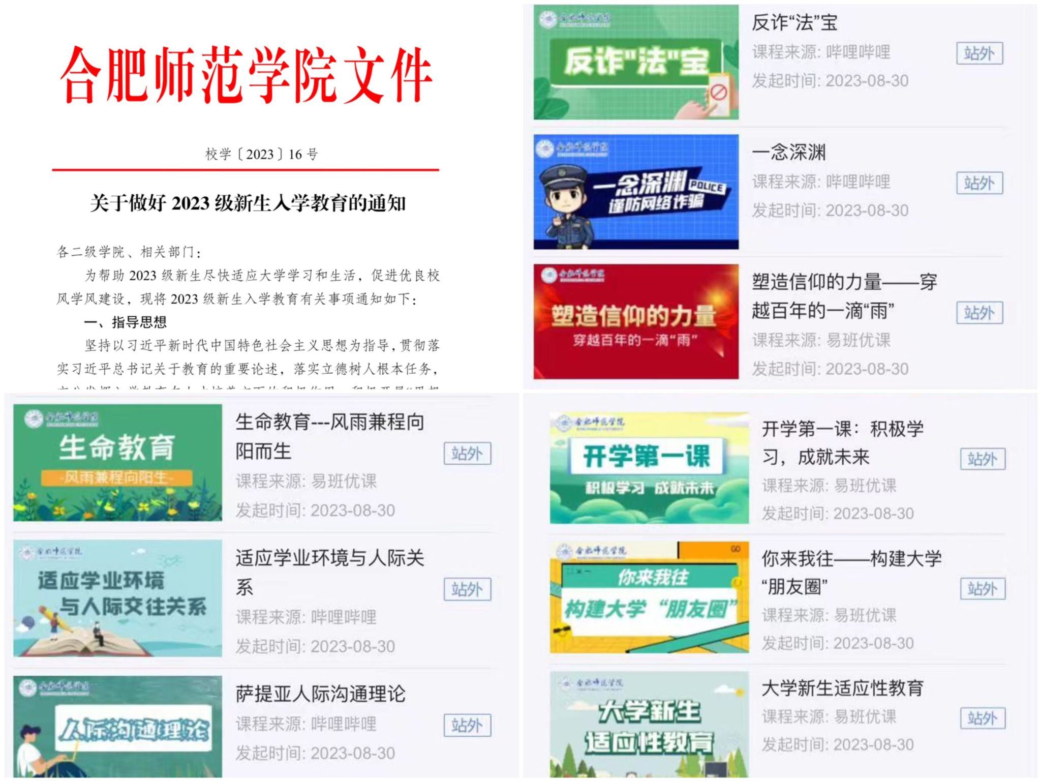 新生入学教育是大学生涯的第一课,是引导新生适应大学生活的重要环节,学院统筹制定入学教育方案,于9月11日至15日集中开展新生入学教育,教育内容分为“思想领航”“大学启航”“青春护航”三大方面,采用线上线下相结合的教育方式,线上运用“今日校园”内优课版块完成规定学习内容,线下采用主题班会、专题报告、主题活动等多种形式,引导广大新生积极树立新目标、适应新环境、争创新成就,努力成长为担当民族复兴大任的时代新人。
