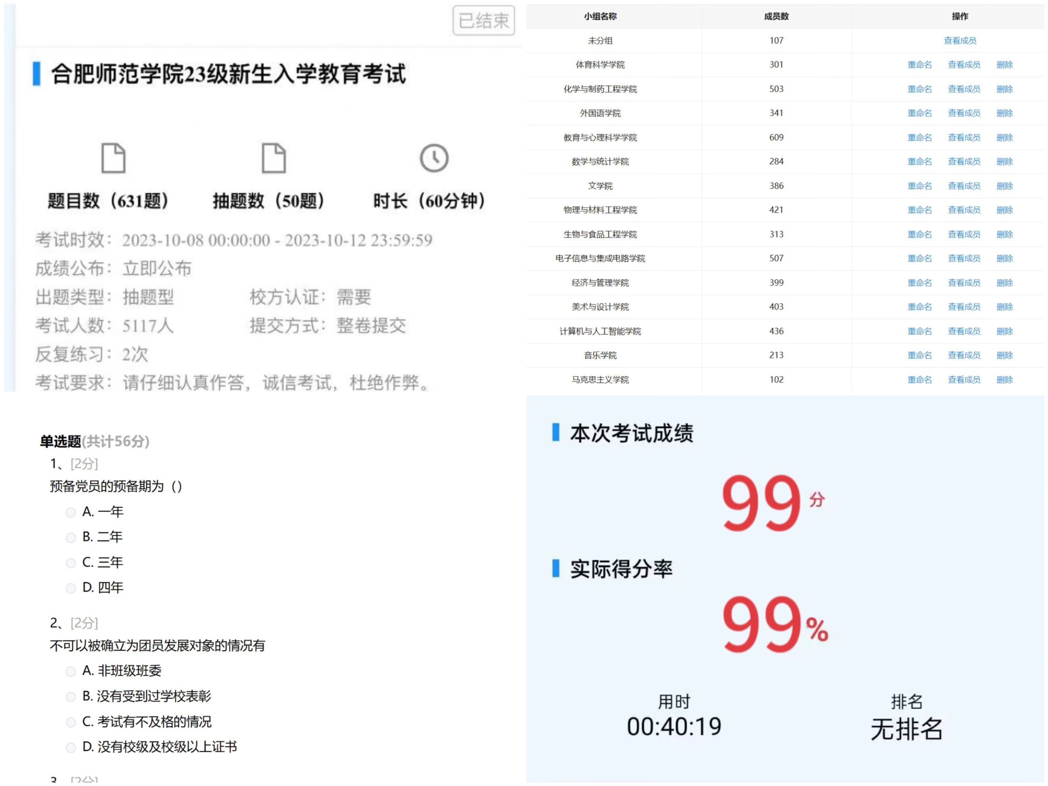 为检验入学教育成效,学院于10月8日至12日组织开展了2023级新生入学教育考试,5000余名新生参加了此次考试。本次考试在“今日校园”平台线上进行,内容涵盖校史校情、校园文化、学风建设、安全教育以及《学生手册》中关于学生管理、日常行为规范等方面的内容,试题题型分单选题、多选题、判断题、填空题四个部分,全面细致考查了学生入学教育内容的学习程度。
