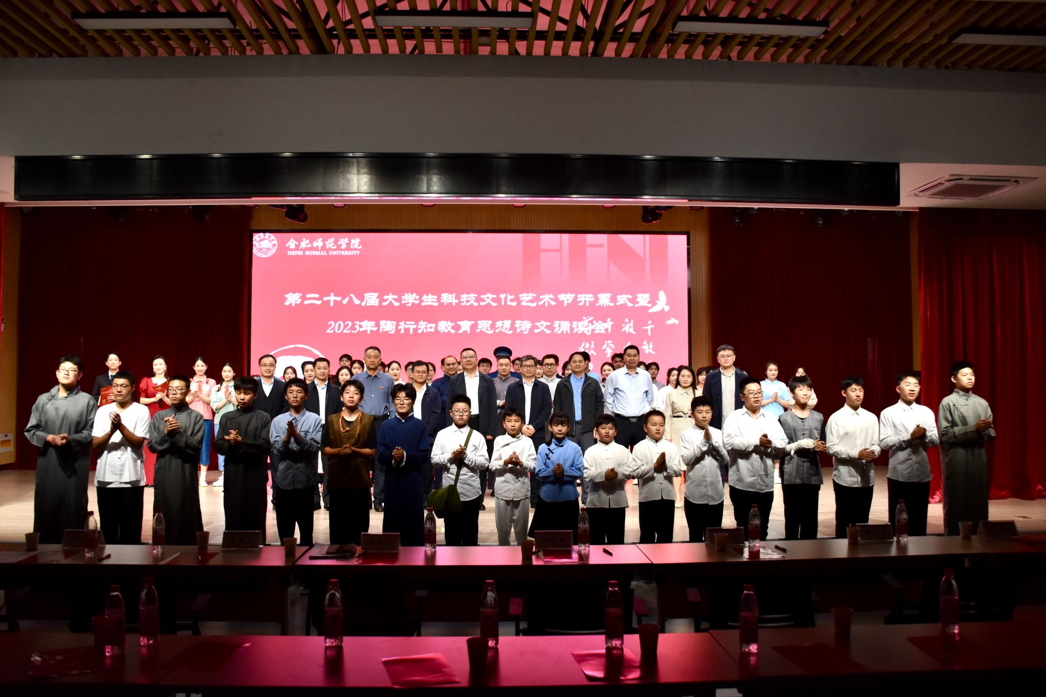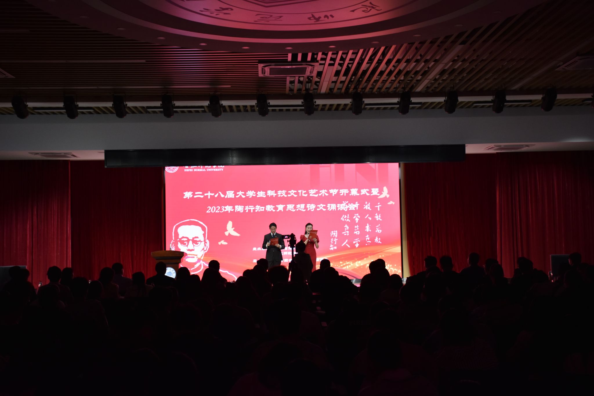 本网讯 10月25日下午,学院于锦绣校区大学生活动中心举办第二十八届大学生科技文化艺术节开幕式暨2023年陶行知教育思想诗文诵读会。安徽省陶行知研究会会长、院党委书记徐成钢,党委委员、副院长华银峰,党委委员、组织部部长赵帮恚,党委委员、宣传部部长常树宝及学院相关部门、附属西安路学校负责人,师生代表200余人到场观看。