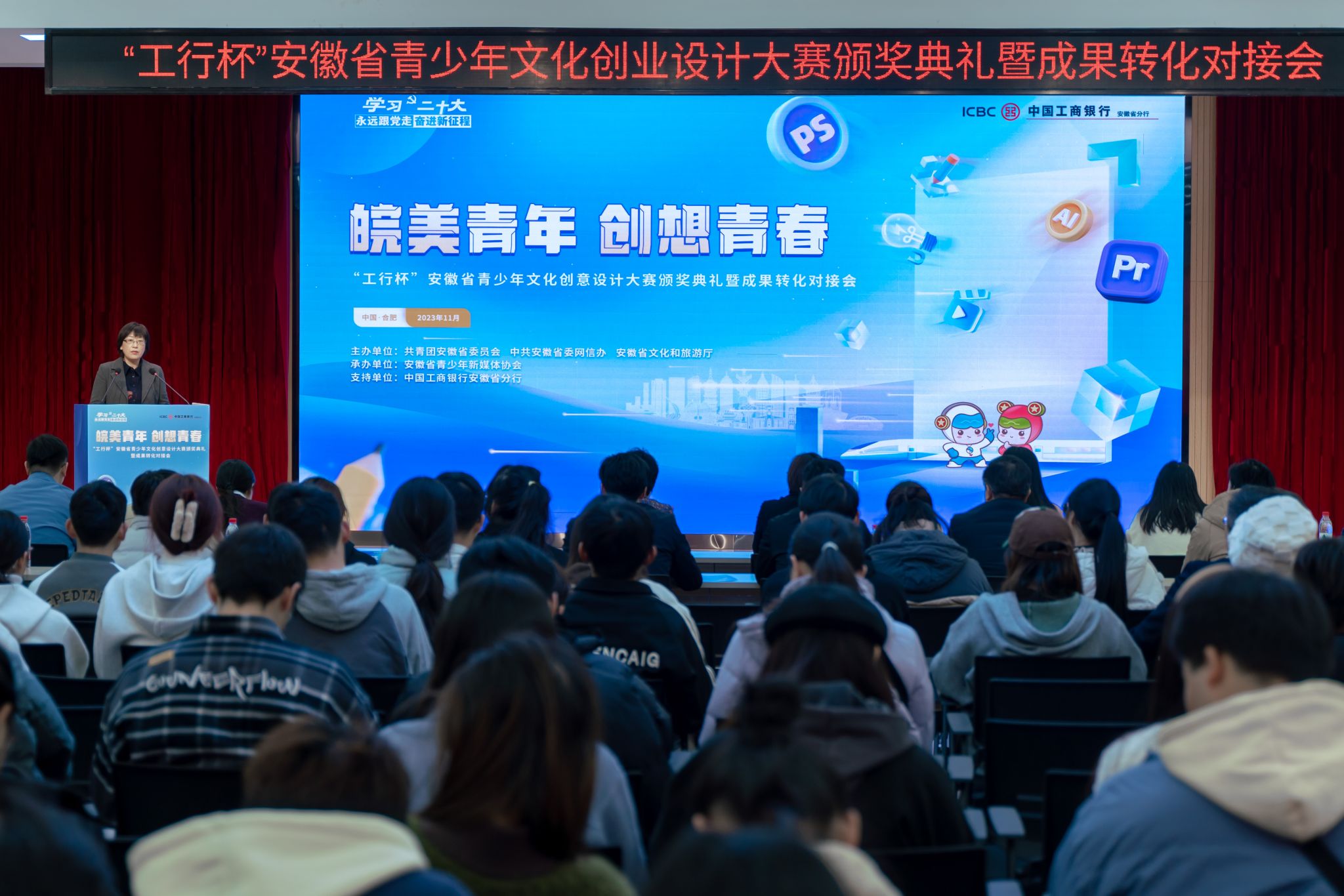 本网讯 11月24日,安徽省“工行杯”青少年文化创意设计大赛颁奖典礼暨成果转化对接会在我院锦绣校区大学生活动中心举行。团省委二级巡视员李丹云,我院党委副书记、院长方东玲,中国工商银行安徽省分行副行长陈文,团省委宣传部部长方芳,省文旅厅、省委网信办、网易安徽及我院相关单位负责人,安徽省青年企业家协会的企业家代表、大赛获奖选手代表、我院学生代表等200余人参加活动。