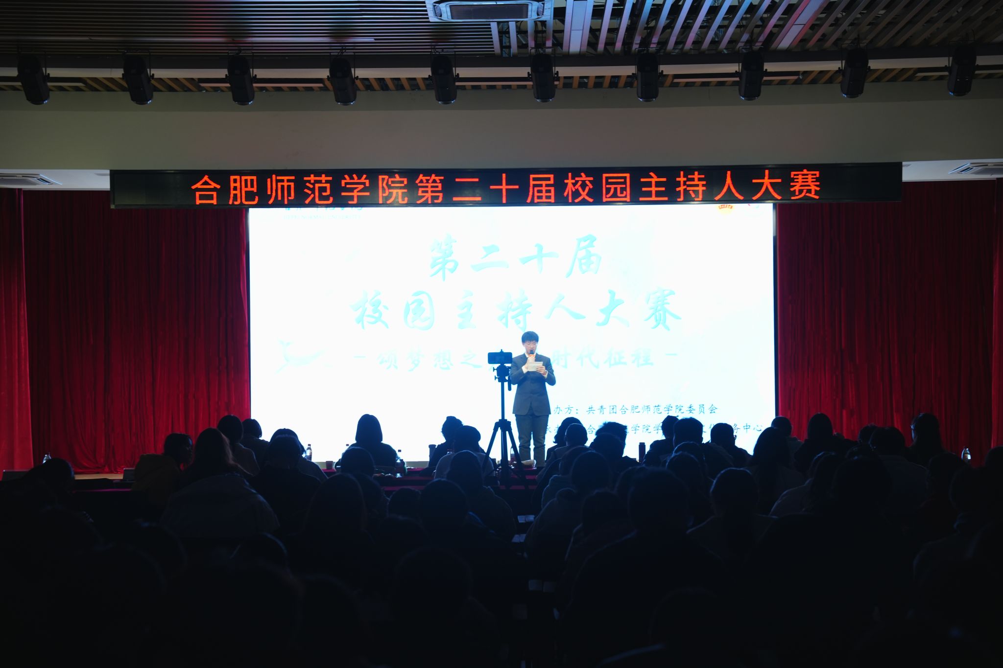 本网讯 12月6日晚,由院团委主办,学生社团文化服务中心承办的“颂梦想之声,赞时代征程”第二十届校园主持人大赛决赛于锦绣校区大学生活动中心顺利举行。院团委、各二级学院团委负责人和400余名学生到场观看比赛,文学院、音乐学院、美术与设计学院、党政办公室、学生工作处等单位专业老师担任评委。