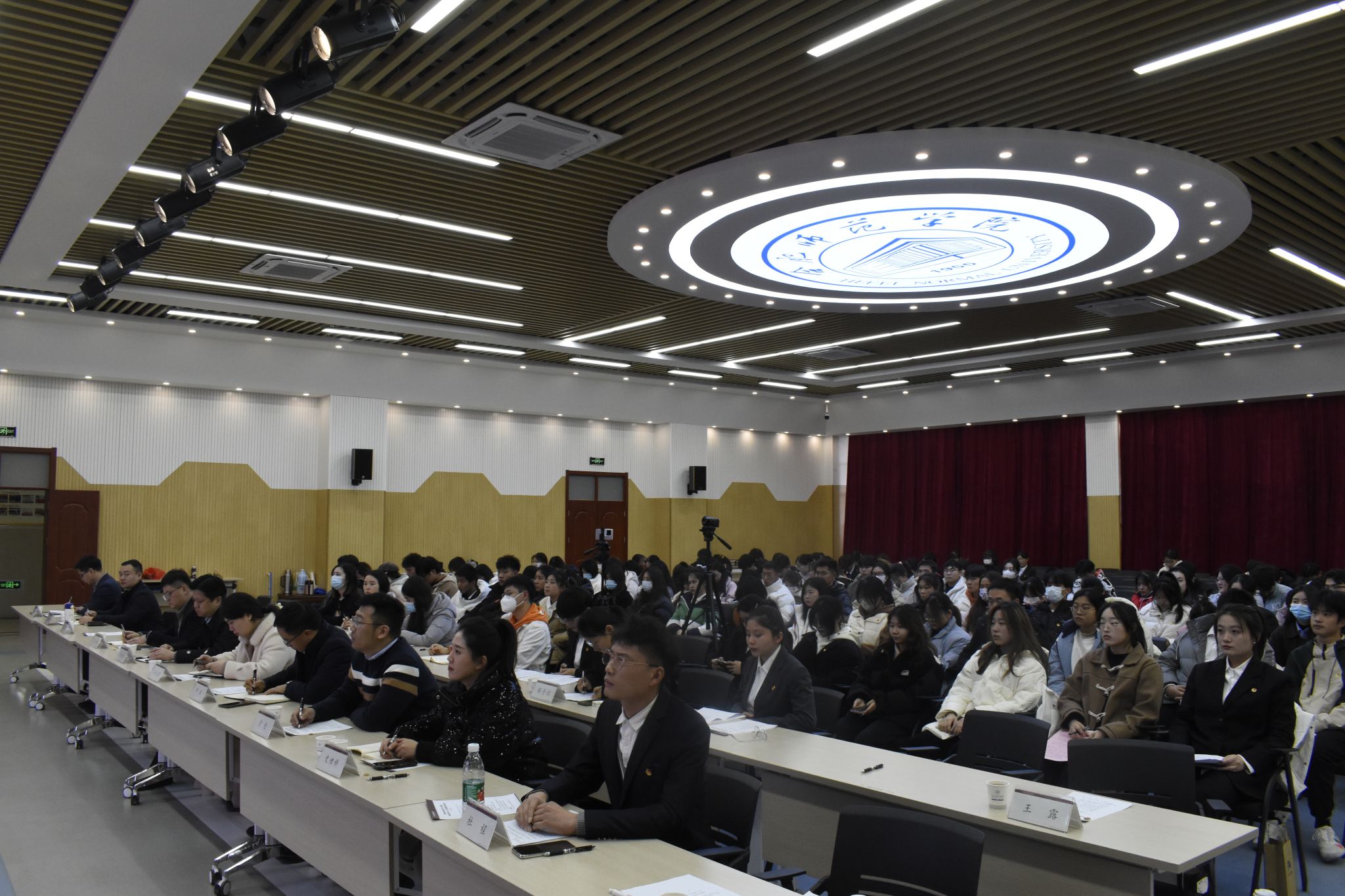 本网讯 12月13日下午,学院“挺膺担当勇作为”示范主题团课暨青春思政课于锦绣校区大学生活动中心举行,滨湖校区分会场设在博学楼D101教室。团省委有关领导到场指导,院团委全体人员、各二级学院团委书记、第十四期青年马克思主义者培养工程和第四期青春学习营全体学员、2023级班级团支部书记300余人参加活动。