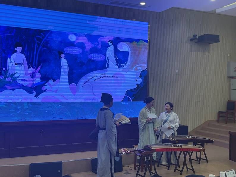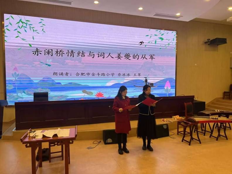 活动首先向大家呈现了合肥本土故事《赤阑桥》,音乐学院江楠团队表演了《赤阑桥畔》,青轻读书会成员、来自包河区金斗路小学乔冰冰和王翠老师带来了散文朗诵《赤阑桥情结与词人姜夔的从军》。我校钱立青教授根据庐州民间传说创作了同名剧本《赤阑桥》。作品以南宋著名词人姜夔与赤阑桥畔琵琶女的知音情缘为线索,演绎出了人民大众奋起抗争外族入侵、誓死保卫家园的一段凄美的故事。《赤阑桥》已经成为合肥城市的一个文化标识。我院师生非常重视传统文化的传承与创新,组建了诸多团队开展研究与创作,编排并上演了话剧版《赤阑桥》,创作了动漫版《赤阑桥》,作品荣获了全省第七届大学生艺术展演的戏剧二等奖和设计二等奖。同时,学生以“合肥往事《赤阑桥》的原创绘本设计”入选2023全省大学生创新创业训练计划。通过《赤阑桥》,现场不少同学们表示对“大湖名城”的合肥有了新认识,充分体现了挖掘区域文化资源的价值与意义。