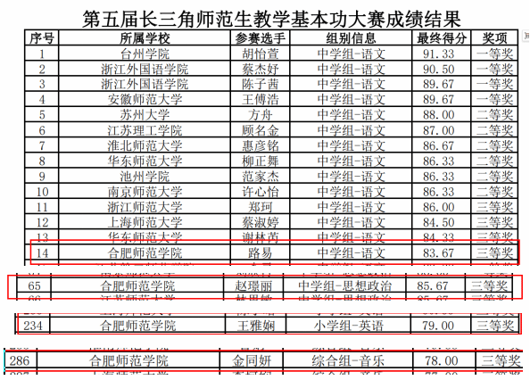 第五届长三角师范生教学基本功大赛在安徽师范大学举办。此次大赛由长三角三省一市教育厅(委)主办,旨在进一步加强长三角教育协作、充分发挥长三角高校在实施卓越教师培养中的引领和示范作用,培养造就一批师德高尚、能力卓越、锐意创新的优秀教师后备队伍。本次比赛共有来自长三角地区40多所高校的305位选手参加,经过角逐,最终我院马克思主义学院赵璟丽同学、教育与心理科学学院王雅娴同学、文学院路易同学、音乐学院金同妍同学,分获中学思政组、小学英语组、中学语文、综合音乐组三等奖的好成绩。