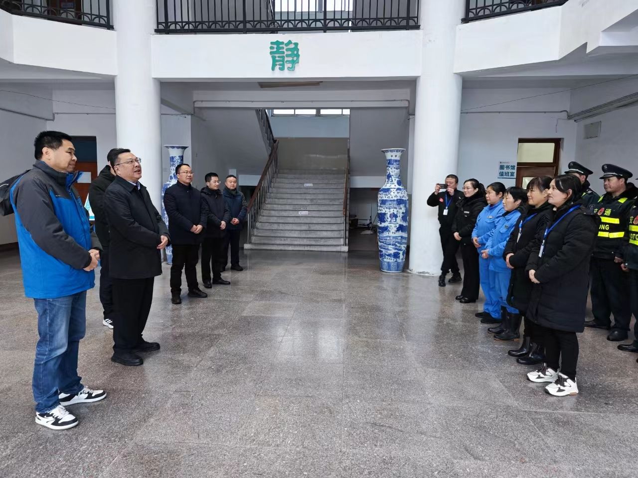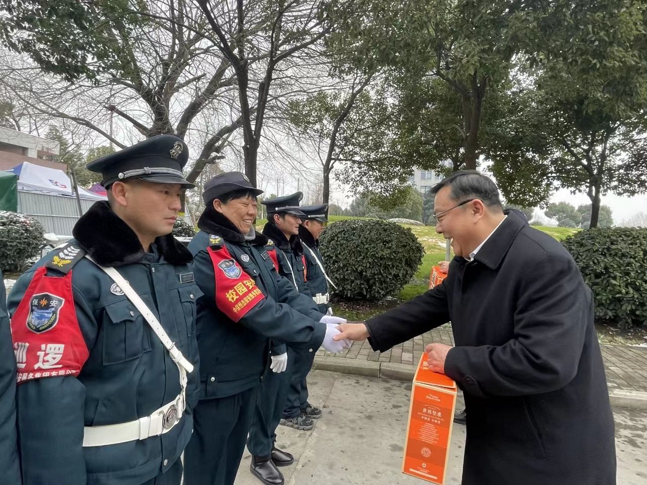 徐成钢一行先后来到学院门卫岗亭、物业服务中心、校医院、值班室、留学生宿舍等,详细了解春节和寒假期间校园值班值守和服务保障等各项工作。每到一处,徐成钢都与坚守岗位的教职员工亲切握手,热情交谈,向他们及其家人致以新春的美好祝福,并代表学院赠送了慰问品。徐成钢强调,要坚持底线思维,压紧压实安全稳定工作责任制,严格执行24小时值班等制度措施,做到校园安全巡查、各类值班值守不缺位;要切实做好水电气等生活服务保障工作,完善各类应急工作预案,确保春节及寒假期间学院各项工作正常运行和校园安全稳定。徐成钢还走访慰问了留学生,送去新春暖心礼包和新年祝福。