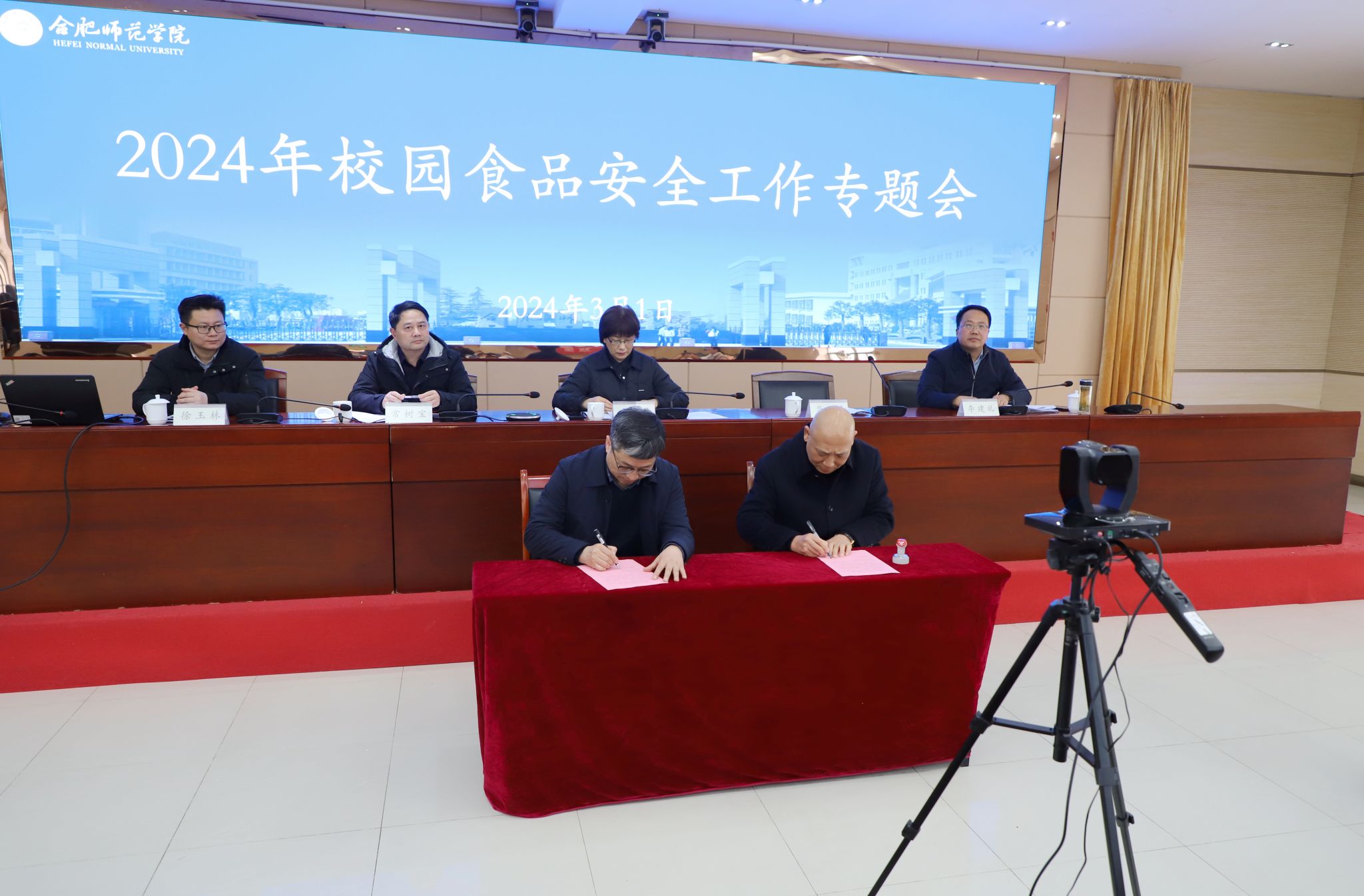 会议现场聘任了学校食品安全总监、5名食品安全员,并创新聘任24名师生代表作为校园食品安全监督员。华银峰代表学院与5家餐饮企业负责人签署了《校园食品安全承诺书》。