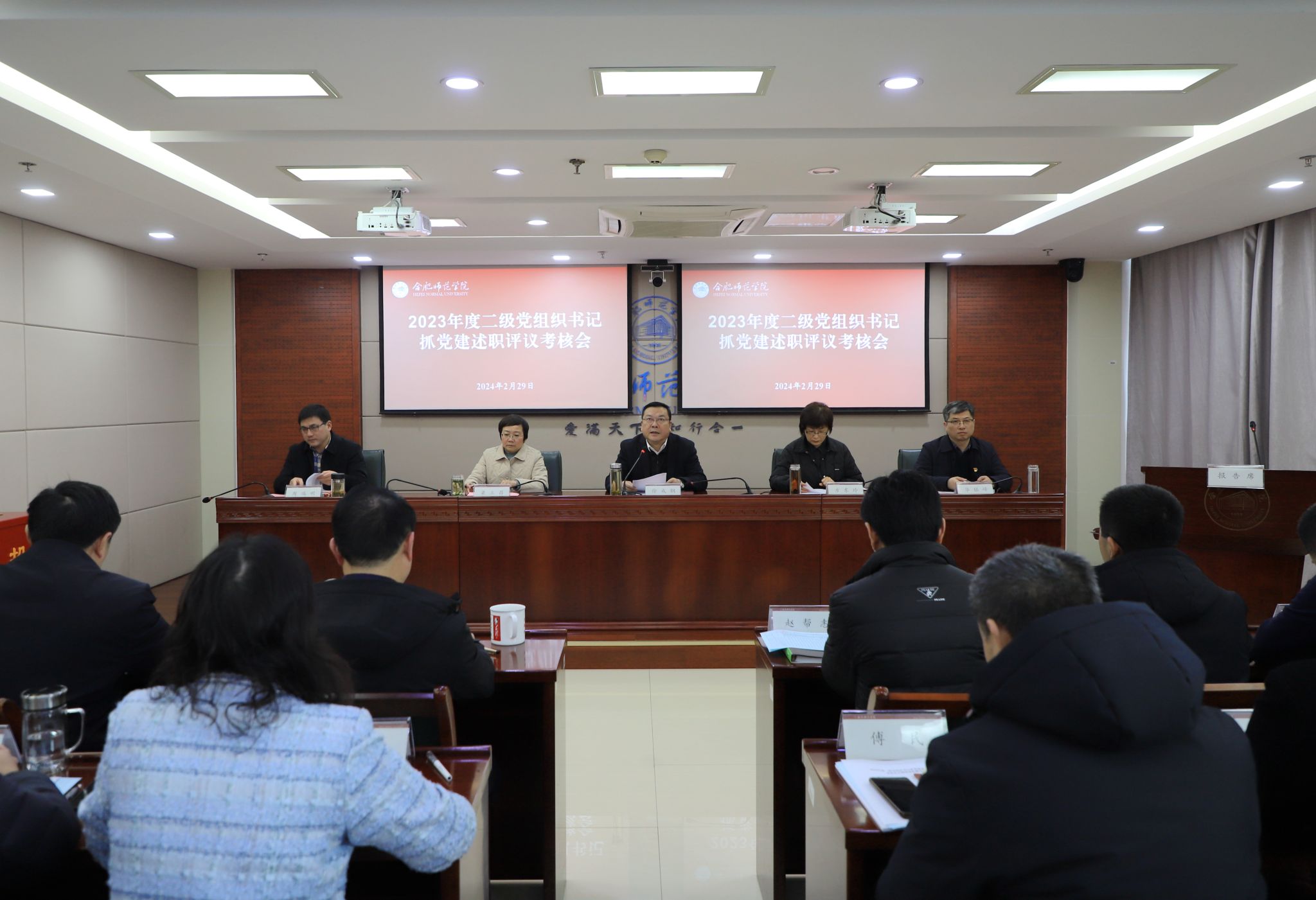 在锦绣校区第三会议室召开2023年度二级党组织书记抓党建述职评议考核会。院党委书记徐成钢,党委副书记、院长方东玲,党委副书记梁立昌,副院长华银峰、副院长周端明出席会议,党委各部门负责人和院团委负责人,各二级党组织书记、副书记,各二级学院院长,基层党支部书记和教师党员代表参加会议。院党委书记徐成钢主持会议。