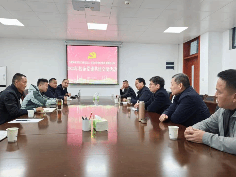 在校企党建共建交流会上,安徽阡陌物业服务集团有限公司董事长、党支部书记田振雨、党支部副书记徐啸威分别就企业支部党建工作情况、企业管理、党建共建、加强合作等方面进行介绍。后勤党总支书记傅民紧紧围绕建设“服务型”党组织,聚焦党建共建、服务师生、党建与事业发展融合等方面进行了交流。