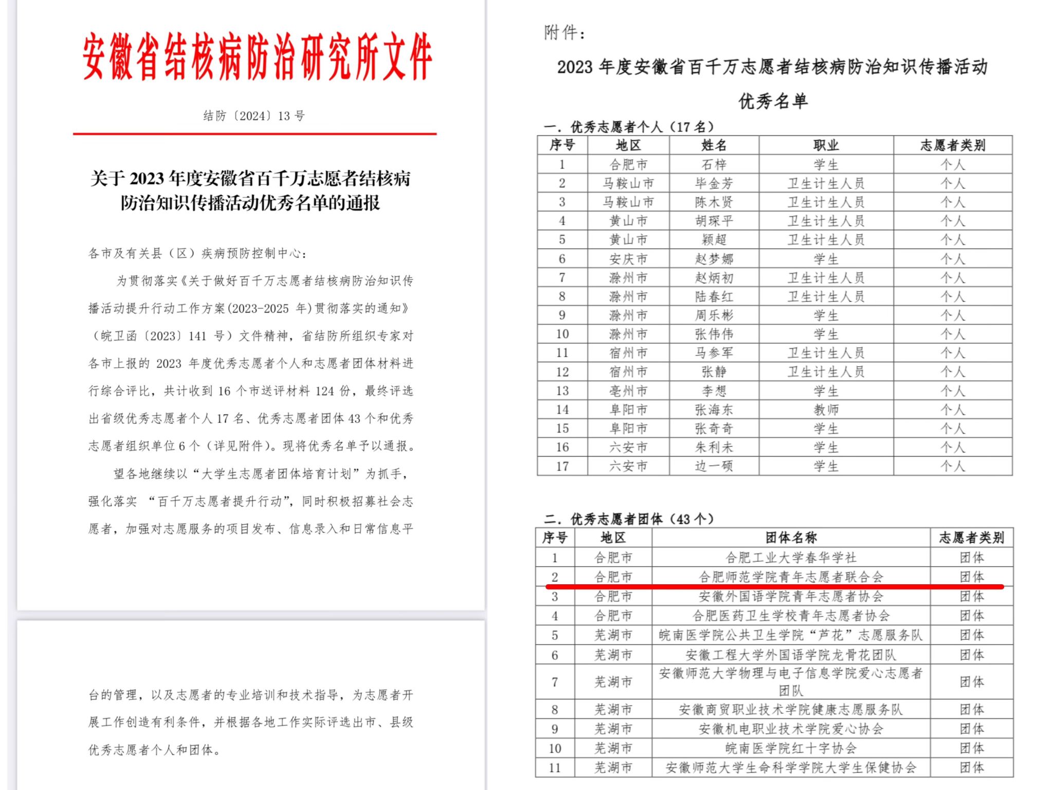 本网讯 近日,安徽省结核病防治研究所公布了《关于2023年度安徽省百于万志愿者结核病防治知识传播活动优秀名单》,我院青年志愿者联合会(以下简称“青志联”)荣获“安徽省优秀志愿者团体“称号。