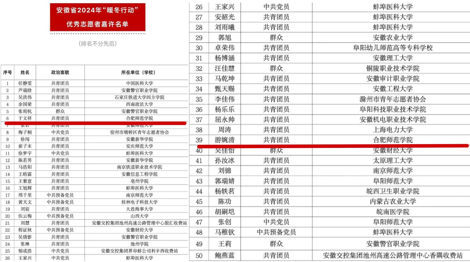 本网讯 为推动安徽省青年志愿者服务春运“暖冬行动”工作提质增效,近日,团省委、省青年志愿者协会联合开展了优秀志愿者推荐嘉许活动,我院教育与心理学学院2023级应用心理学(师范)专业于文祥、美术与设计学院2022级美术学(师范)专业游婉清2名同学荣获“暖冬行动优秀志愿者”称号(全省仅50名)。