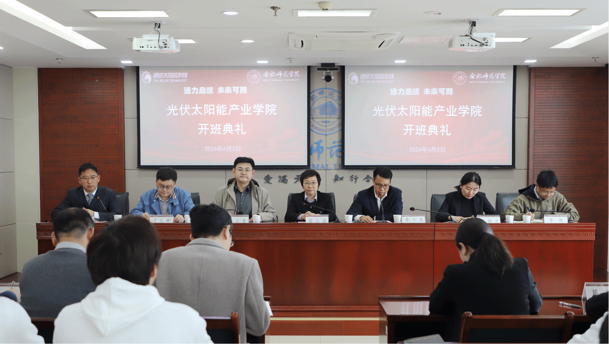 本网讯 4月3日上午,学院在锦绣校区行知楼2011会议室举行光伏太阳能产业学院开班仪式。党委副书记梁立昌,通威太阳能(组件)合肥基地负责人李冬生,人事处、教务处、学生工作部、就业创业工作处负责人以及物理与材料工程学院、电子信息与集成电路学院党政负责人、产业学院产业班全体同学参加会议,物理与材料工程学院副院长訾振发主持开班仪式。