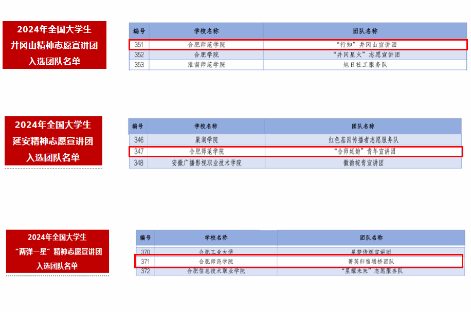 本网讯 近日,团中央青年志愿者行动指导中心公布了《关于遴选2024年全国大学生井冈山精神志愿宣讲团的公告》《关于遴选2024年全国大学生延安精神志愿宣讲团的公告》《关于遴选2024年全国大学生“两弹一星”精神志愿宣讲团的公告》,我院“行知”井冈山宣讲团、“合师延韵”青年宣讲团和菁英归宿埇桥团队3个志愿服务团队分别入选。