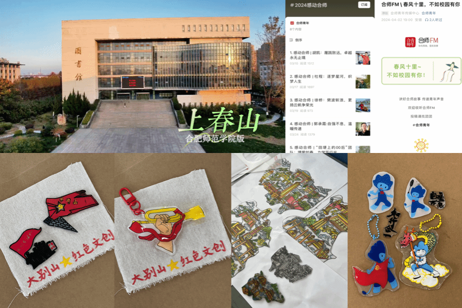 依托校园网络新媒体矩阵,策划推出优质文化产品,积极传播青春正能量,倡导理性文明上网,规范网络文明行为,营造清朗网络空间。上线“感动合师”“军旅献青春”“西部计划”人物专访栏目,用生动的榜样故事展示青春风采。音乐学院团委开展“音乐点亮希望,助力山区教育”活动,以音乐表演的形式呼吁青年学生关爱乡村儿童,并以手写明信片、制作手工作品的形式,向儿童传递温暖关怀。美术与设计学院团委组织师生团队从文化元素的音、形、色和行为四个方面对大别山红色文化进行分析和元素提取进行红色文创设计。计算机与人工智能学院团委举办“创建网络文明,营造和谐校园”短视频征集活动,同学们围绕校园网络诈骗、网络用语文明等议题,以短视频的形式展示网络环境潜在风险和应对之策,呼吁营造风朗气清的网络生态。合师青年传媒中心摄制合肥师范学院版《上春山》,欢快的旋律、明快的节奏、悠扬的歌声、饱满的画面,展示了学院春日里的绝美景象;推出“合师FM”“青年观察家”等精品栏目,用镜头画面和细腻笔触,展示同学们创作的优秀图片和文字作品。
