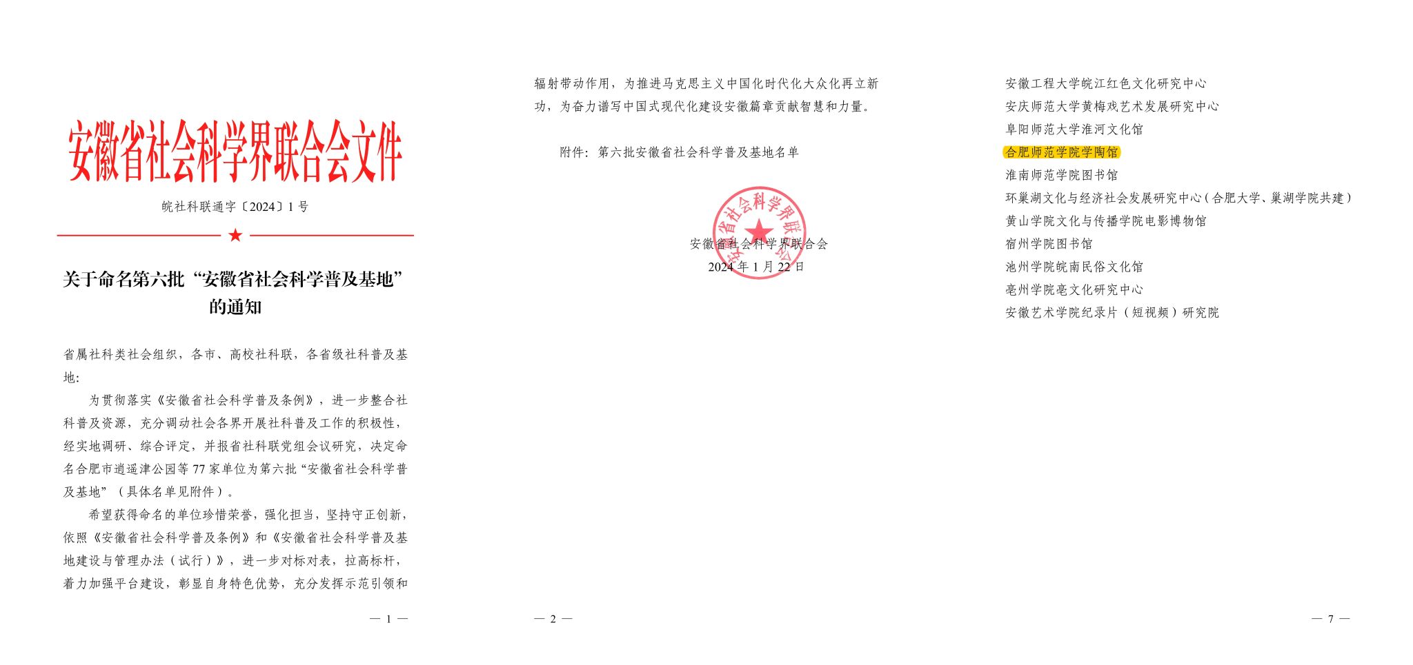 本网讯 近日,安徽省社会科学界联合会发布《关于命名第六批“安徽省社会科学普及基地”的通知》,我院学陶馆名列其中。