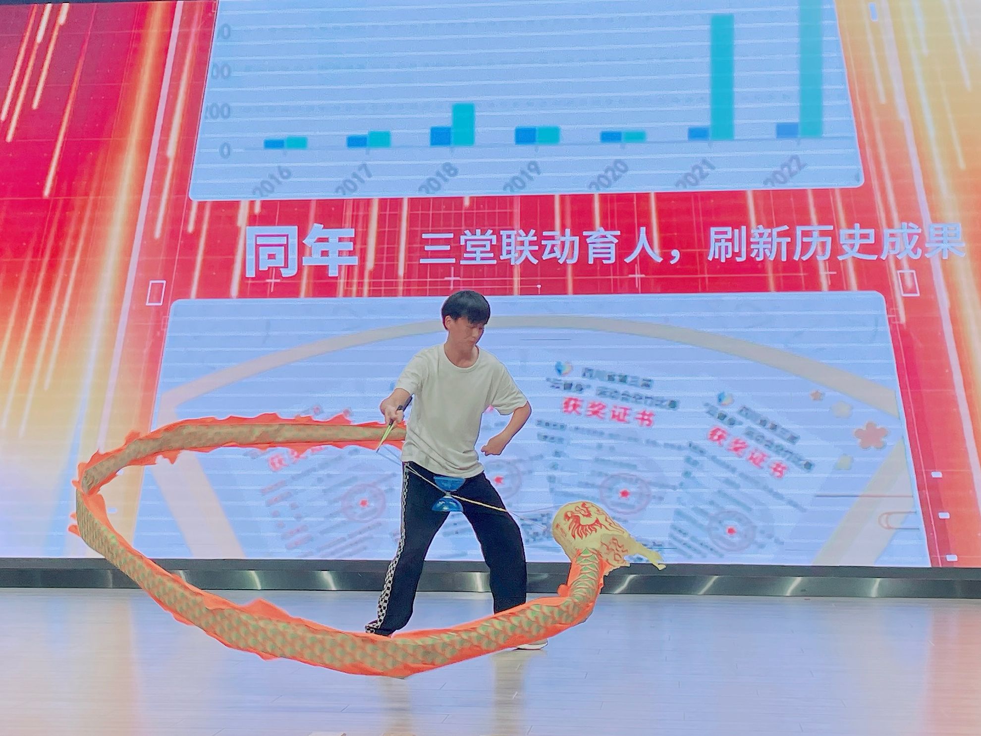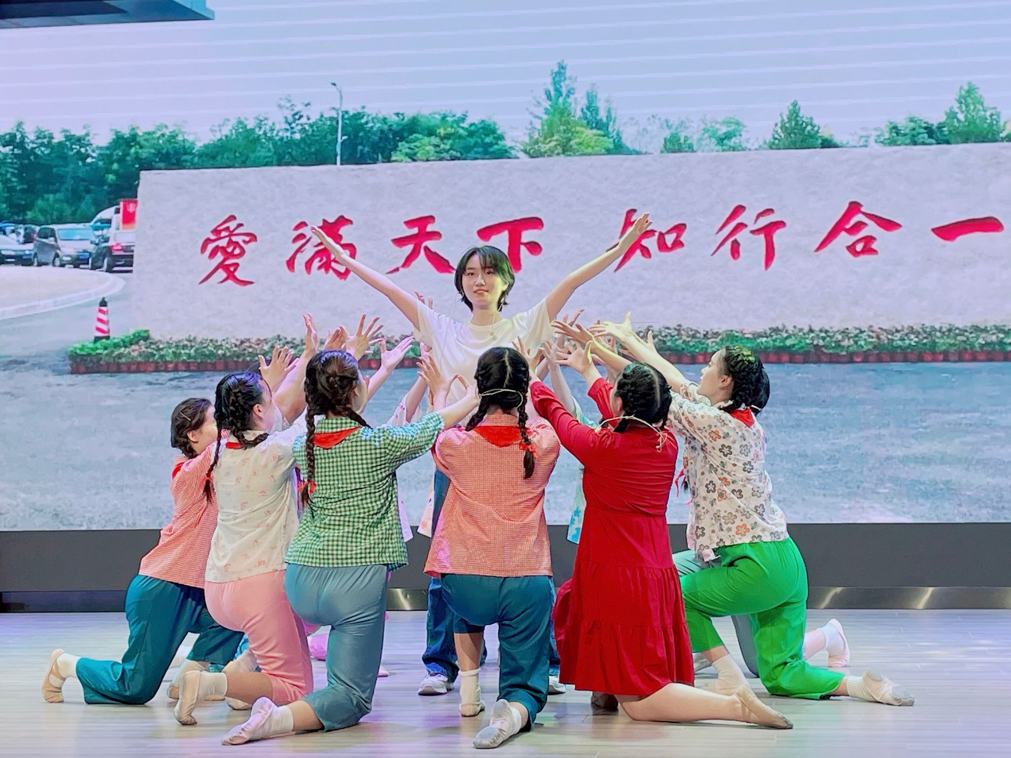 开幕式文艺表演在学前教育专业选送的幼儿韵律操《孩子的天空》中拉开帷幕,欢快的运动节奏、灵活的肢体语言展现了大学生昂扬向上的青春活力。附属西安路学校选送的课本剧《梅兰芳蓄须》,讲述了京剧大师梅兰芳先生蓄须明志的爱国故事,6位小学生的纯真演出,赢得了现场观众的阵阵掌声。学前教育专业选送的古典舞《茉莉花》,展现了学生们扎实的专业技能,优美的舞姿让现场观众如痴如醉。小学教育专业选送的空竹表演《水龙吟》,完美呈现了青年大学生对中华优秀传统文化的传承和创新。荣获安徽省第七届大学生艺术展演一等奖的原创音乐剧《燃灯远山 守望未来》讲述了合师学子扎根基层,积极服务乡村教育的感人故事,学生们将支教老师与留守儿童的师生情谊演绎的感人至深。随后,2020级两位优秀学生代表进行了精彩发言,今年以407分笔试成绩、专业第一优势,成功考取南京大学硕士研究生的杨云康同学分享了自己在行知文化引领下奋发向上、追求卓越的成长经历;荣获第九届“田家炳杯”全国师范院校师范生教学技能竞赛一等奖等80余项奖项获得者的王雅娴同学,讲述了自己以行知精神为引领,在追寻行知的道路上育师德、养师爱、学师才、练师能的奋斗人生。应用心理学专业选送的朗诵《四季行知》,充分展现了陶行知先生的教育思想和开拓求新的创造精神。学院合唱团带来的歌曲《红心牵绊 母子情长》和《校歌》,婉转流长,气势磅礴,唱出了教院学子奋勇争先的青春华章,为开幕式艺术表演画上圆满句号。