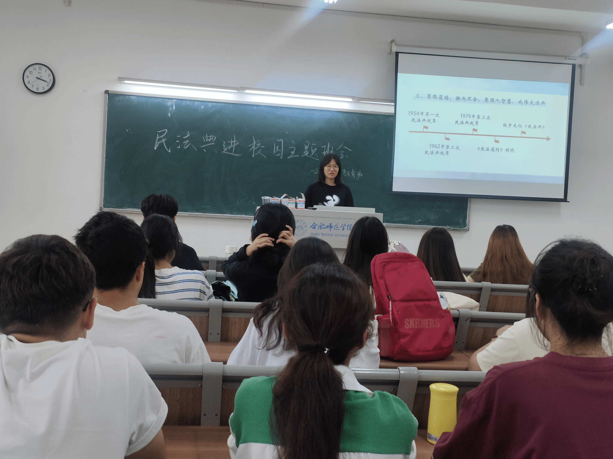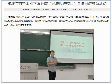 开展一期主题班会。教育与心理科学学院、外国语学院、物理与材料工程学院等先后开展“民法典进校园”等主题班会。通过研讨、案例分析、经验分享等形式,辅导员老师向同学们讲解了民法典颁布背景及重要意义,引导大家深刻领会民法典与日常生活的密切关系。