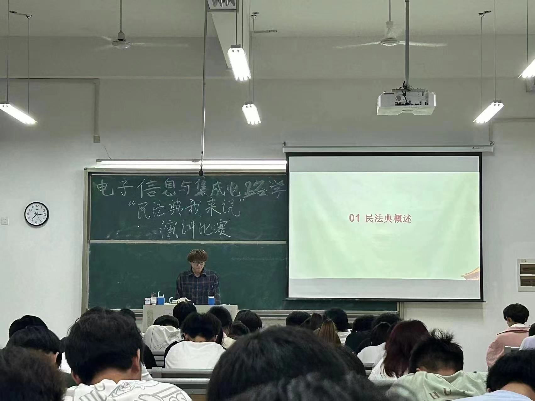 举办一场演讲比赛。电子信息与集成电路学院等举行“民法典我来说”演讲比赛,通过各二级学院初步遴选,共有107名学生参与,10名选手进入决赛,选手们围绕民法典的立法背景、基本原则、创新亮点等方面,展开精彩演讲。经过激烈角逐,最终评选出一等奖1名、二等奖2名、三等奖3名。