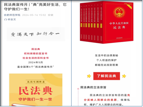 开展推送一篇学习推文。学院通过官微等新媒体平台,向全体师生推送“典亮美好生活,它守护我们一生!”民法典学习推文,内容涵盖“了解民法典、校园生活中民法典、民法典基本内容”三个板块,通过漫画对话等形式,生动地阐释了民法典是什么、为什么学民法典、学什么等内容。