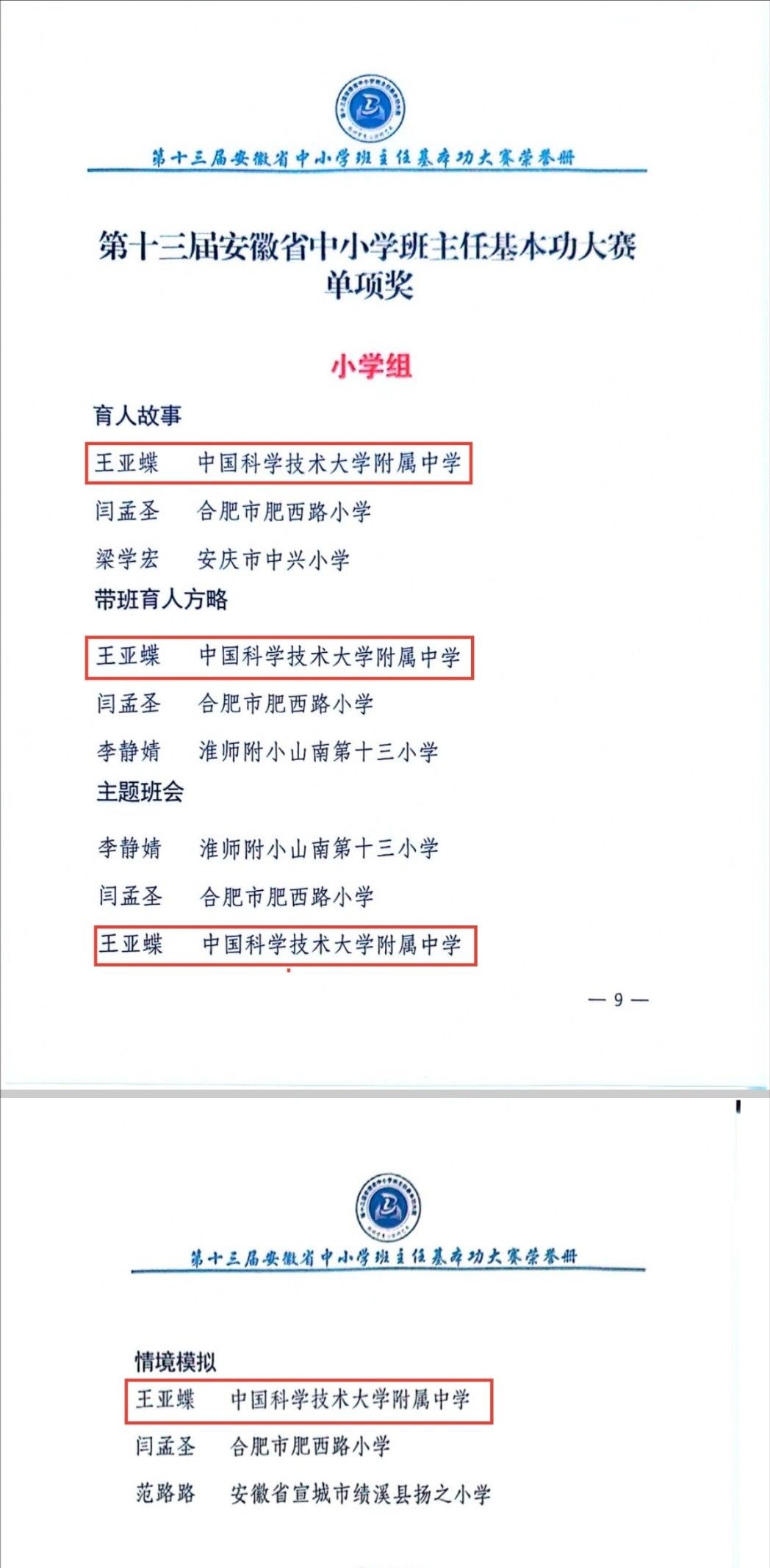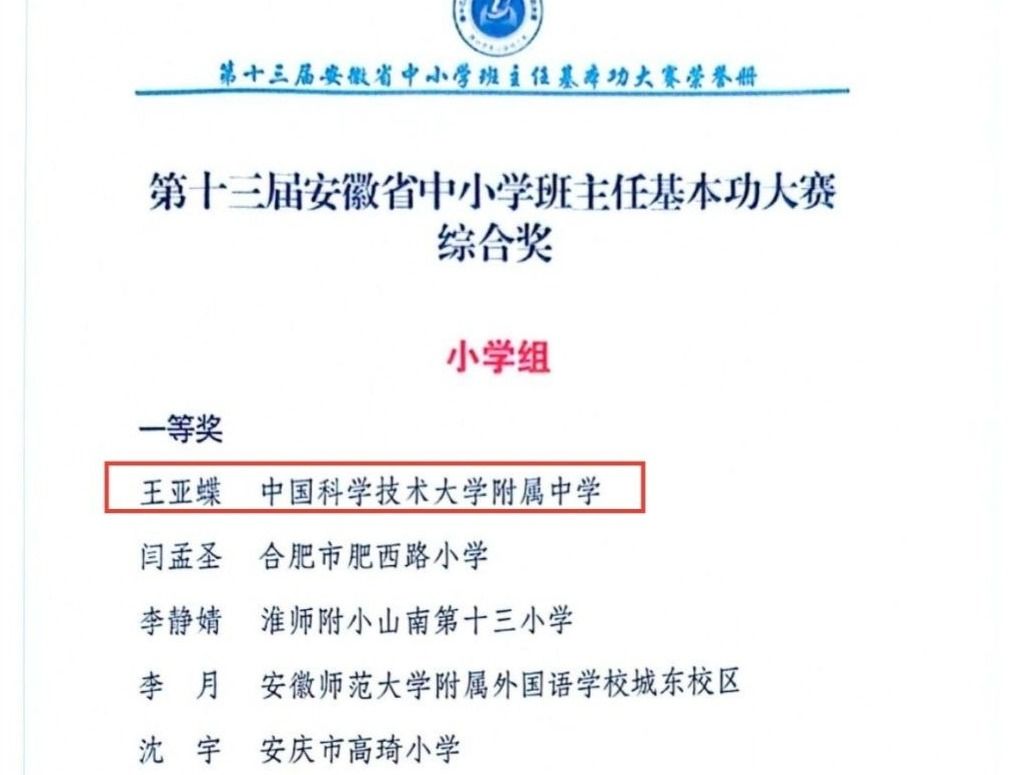 8月13日至15日,安徽省第十三届中小学班主任基本功大赛在宿州市成功举办,来自全省16个市的96名选手同台竞技、一决高下。本届安徽省中小学班主任基本功大赛以“拨动学生心弦的艺术”为主题,设置了育人故事、带班育人方略、主题班会和情境模拟四项内容,采用了线上线下相结合的方式进行评比,全方位考查班主任育人理念以及带班智慧。经过多个环节激烈角逐,我院小学教育专业校友、合肥市包河区中科大附属中学小学部王亚蝶凭借扎实的班主任基本功底、先进的育人理念、过硬的心理素质和出色的临场表现,从全省96位选手中脱颖而出,不仅斩获小学组综合奖第一名,还摘得育人故事、带班育人方略、主题班会、情境模拟等多个单项奖第一名。不久她将代表安徽省参加长三角地区班主任基本功大赛。